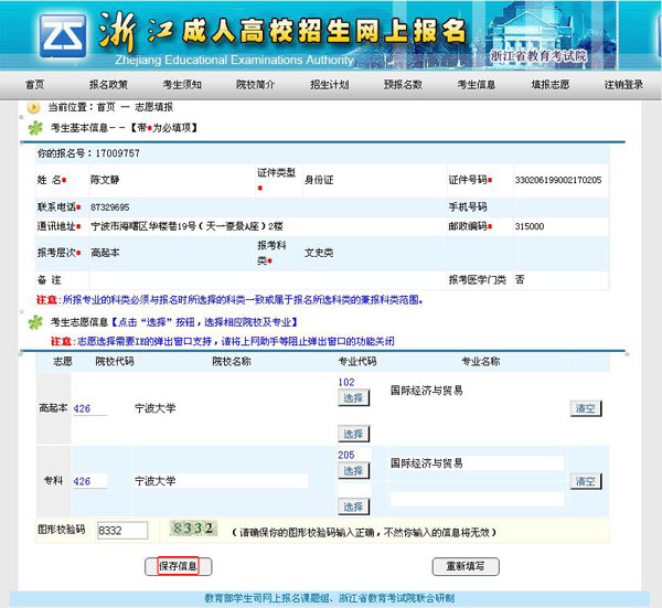 第七步:认真核对本人所填报的专业,如无误后输入“图形校验码”并点击“保存信息”。