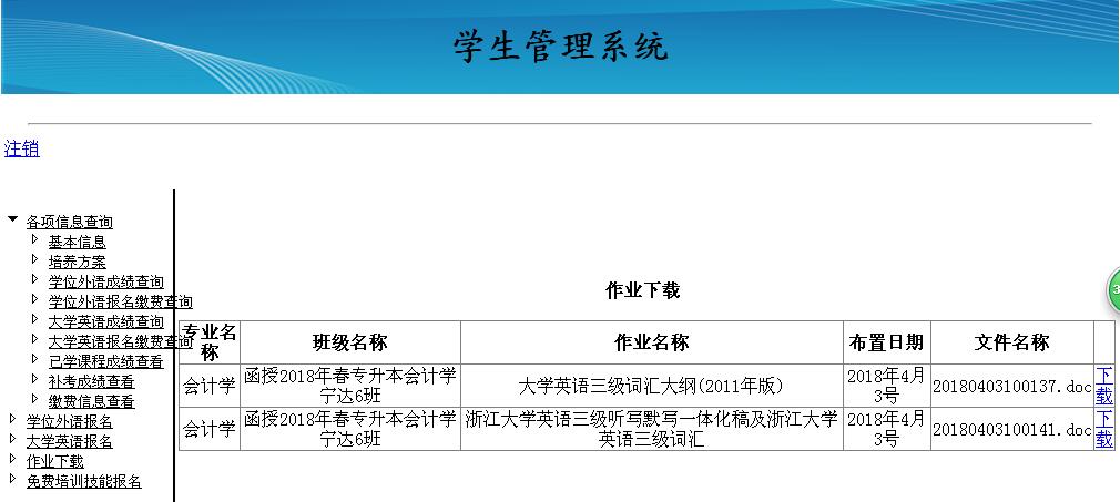 4. 进入学生管理系统后点击左下角“作业下载”,则会出现如下所示页面。学生根据自身需求点击右侧下载,下载相应作业即可。